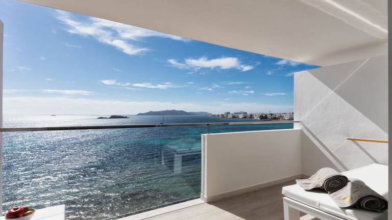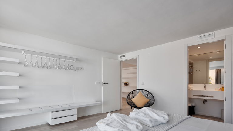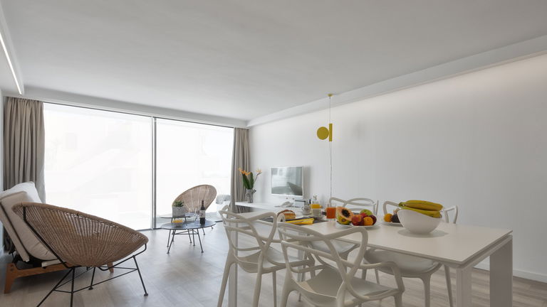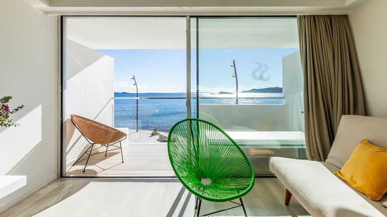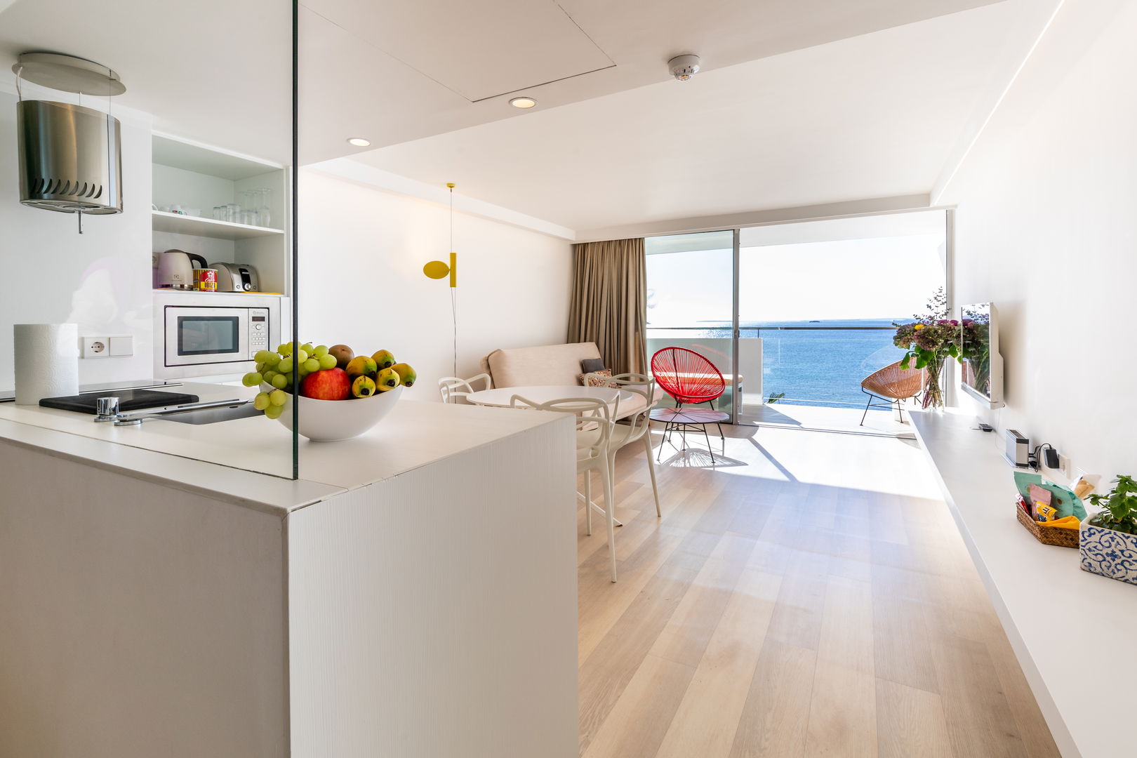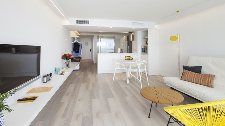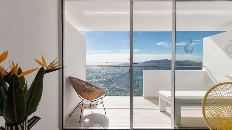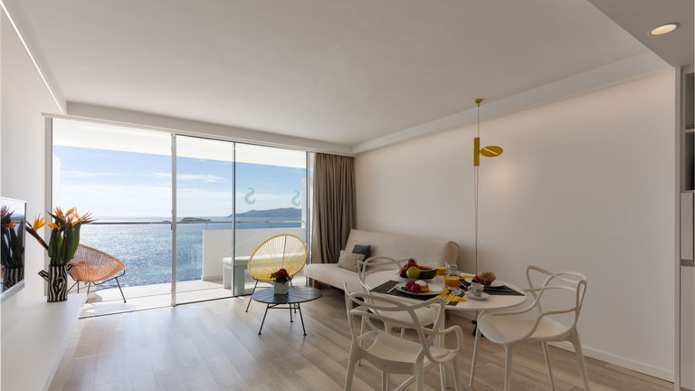 The complex has 18 Executive South studios located on the first three floors of the building. These studios measure approximately 45 m², including a large 7 m² terrace with direct views of the sea and the neighboring island of Formentera. They accommodate up to three people and feature a private bathroom with a hairdryer, a double bed, a safe, a kitchen equipped with a refrigerator, microwave, ceramic hob, Nespresso coffee machine, and dishwasher, and a spacious living area with a sofa bed and flat-screen TV.