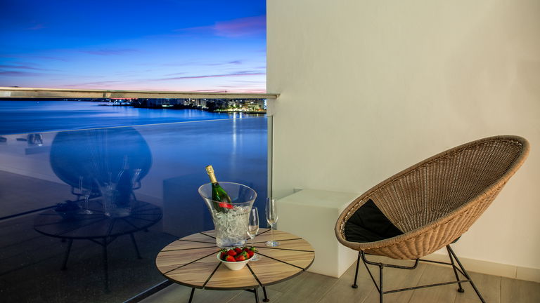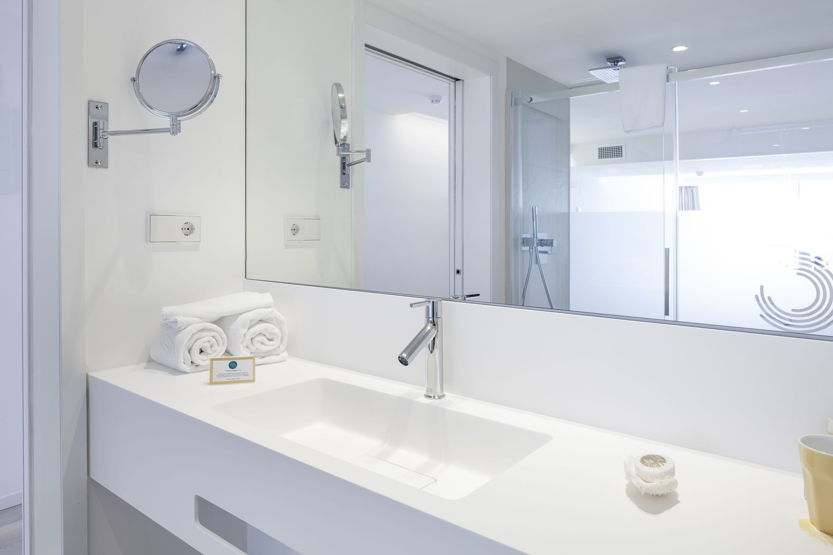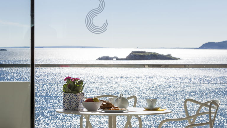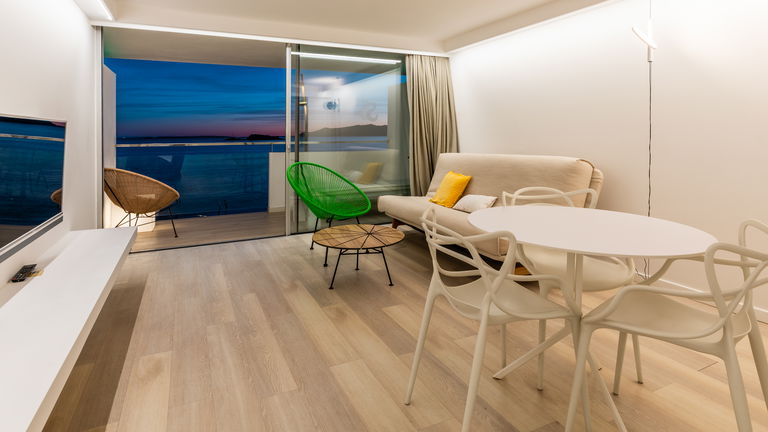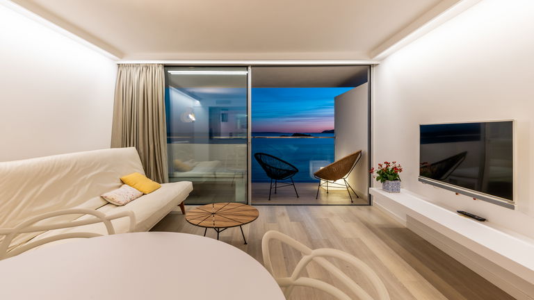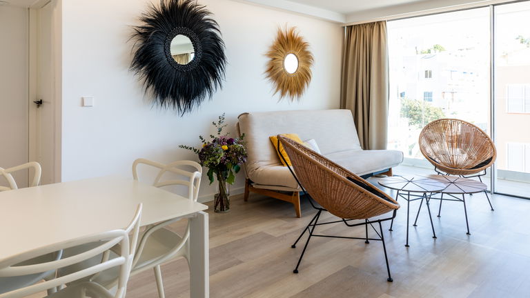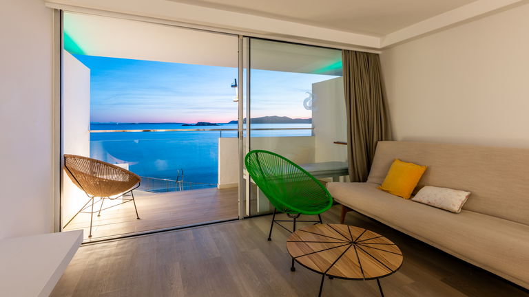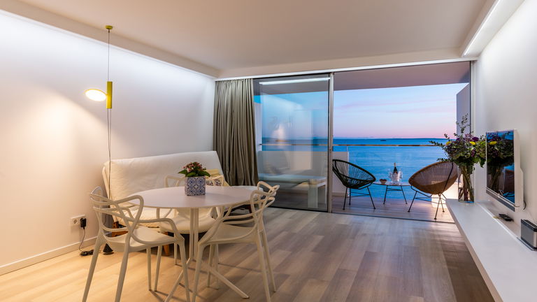 The complex has 18 Executive South studios located on the first three floors of the building. These studios measure approximately 45 m², including a large 7 m² terrace with direct views of the sea and the neighboring island of Formentera. They accommodate up to three people and feature a private bathroom with a hairdryer, a double bed, a safe, a kitchen equipped with a refrigerator, microwave, ceramic hob, Nespresso coffee machine, and dishwasher, and a spacious living area with a sofa bed and flat-screen TV.