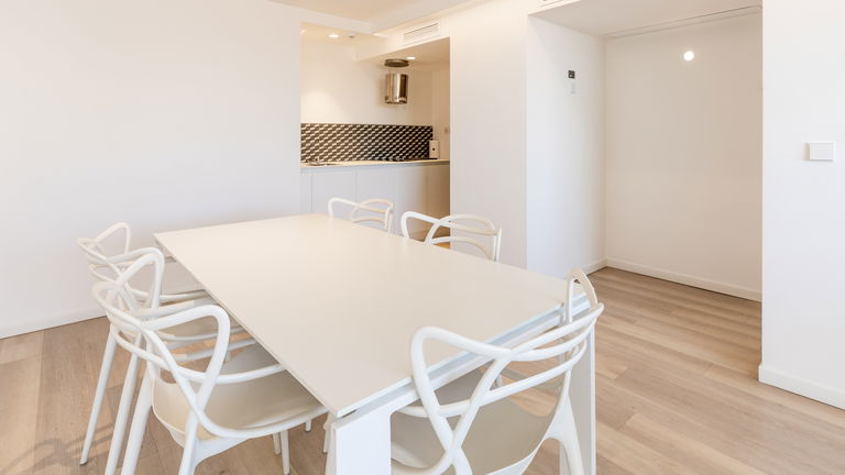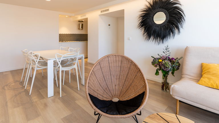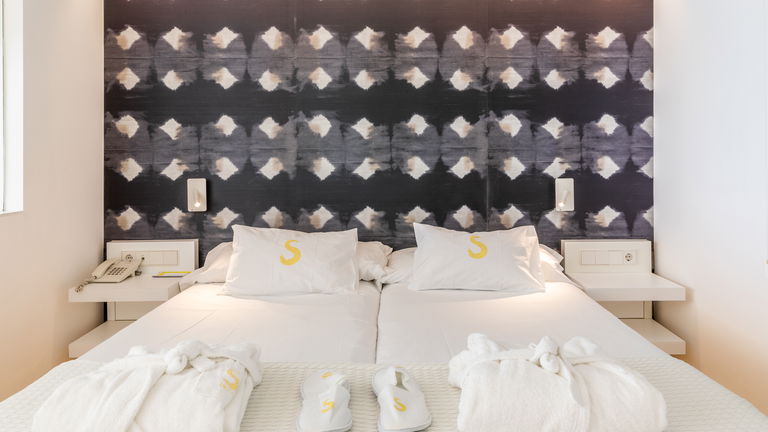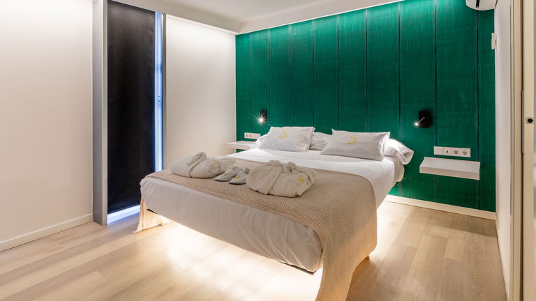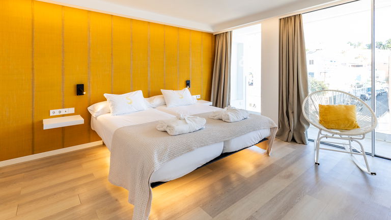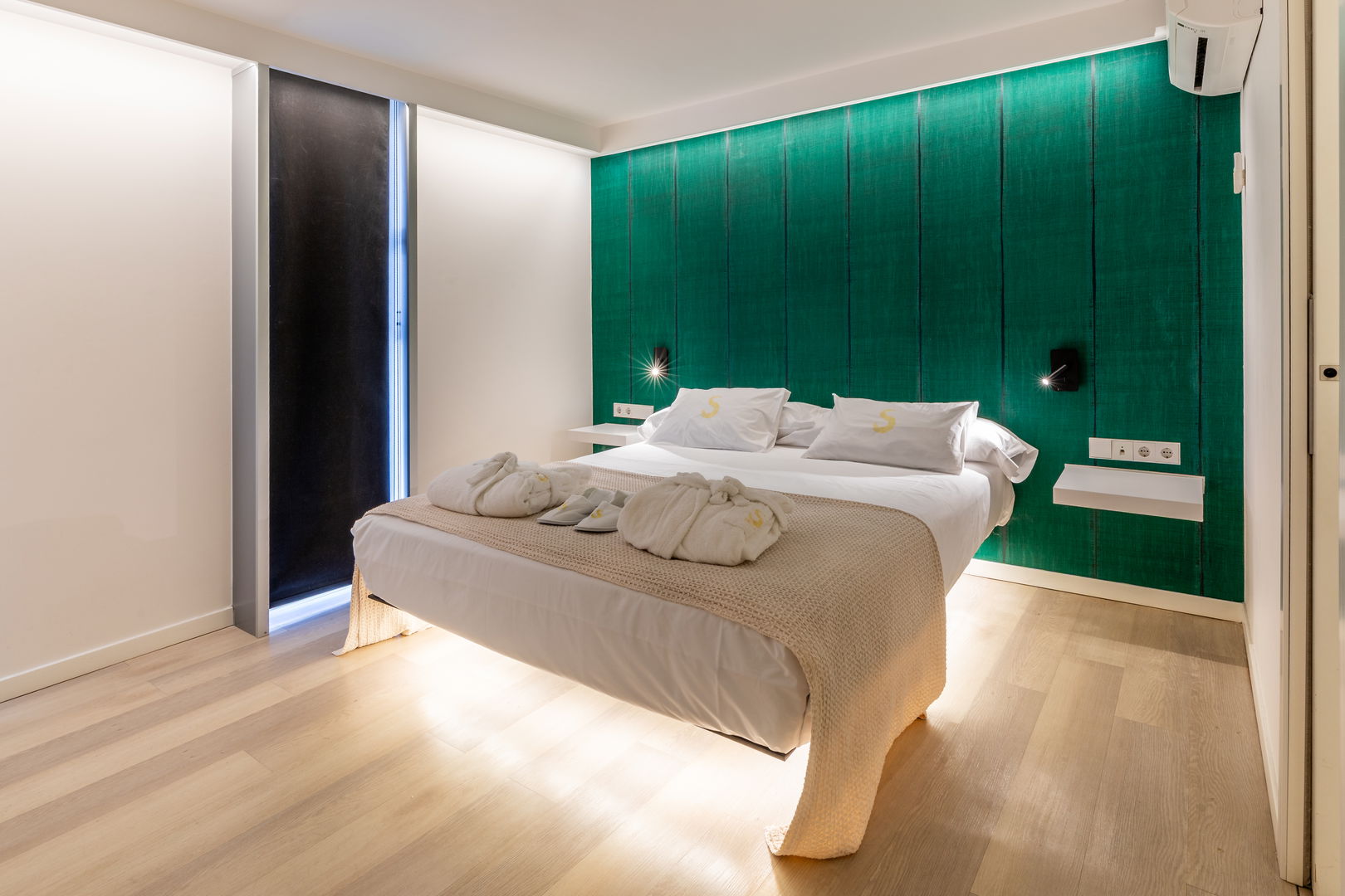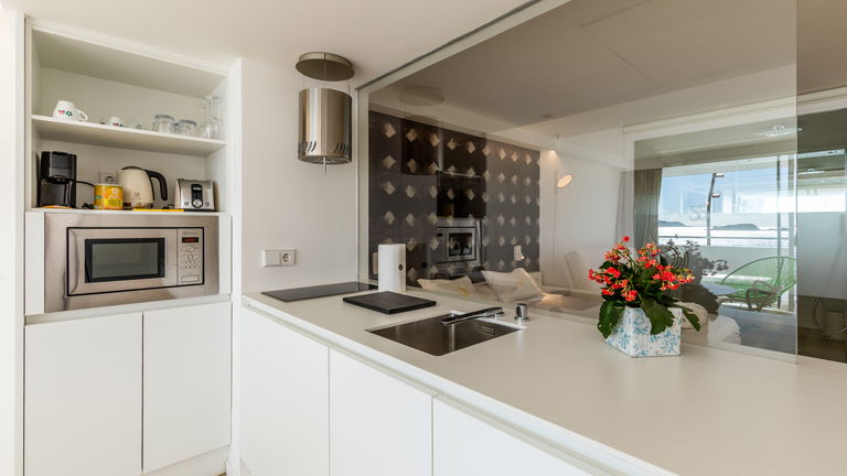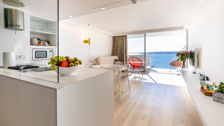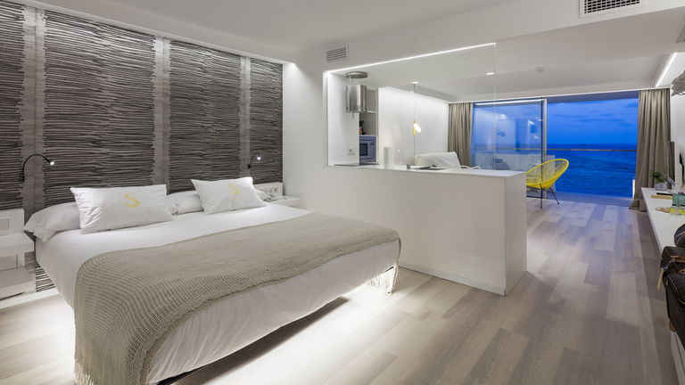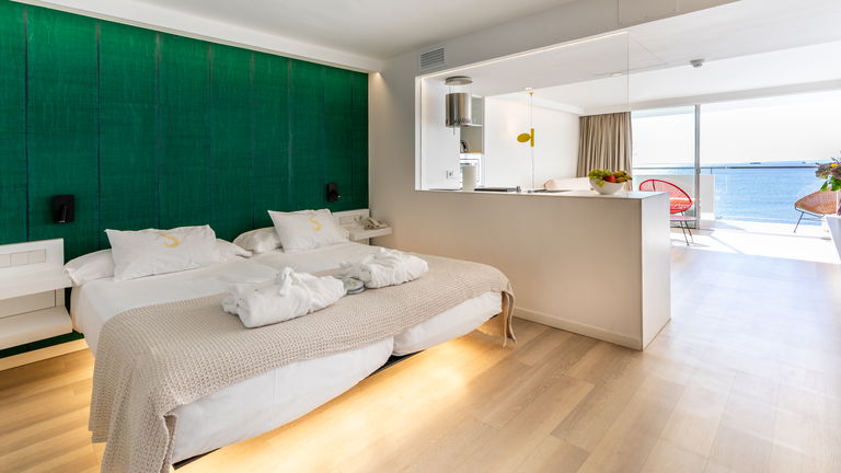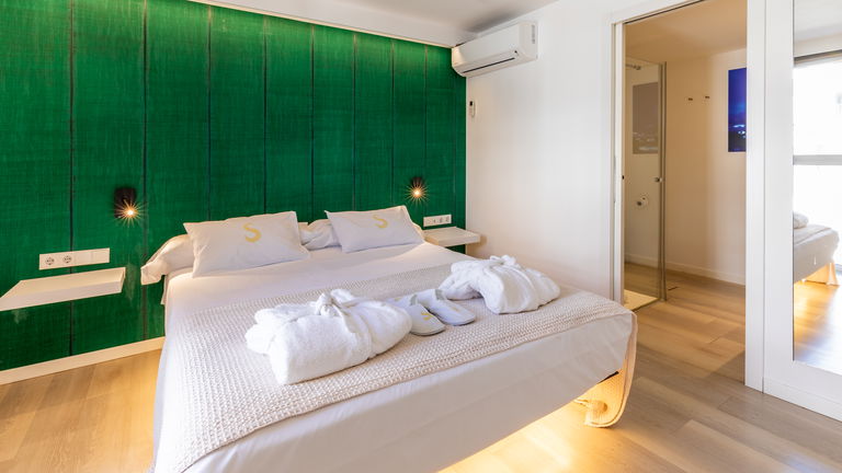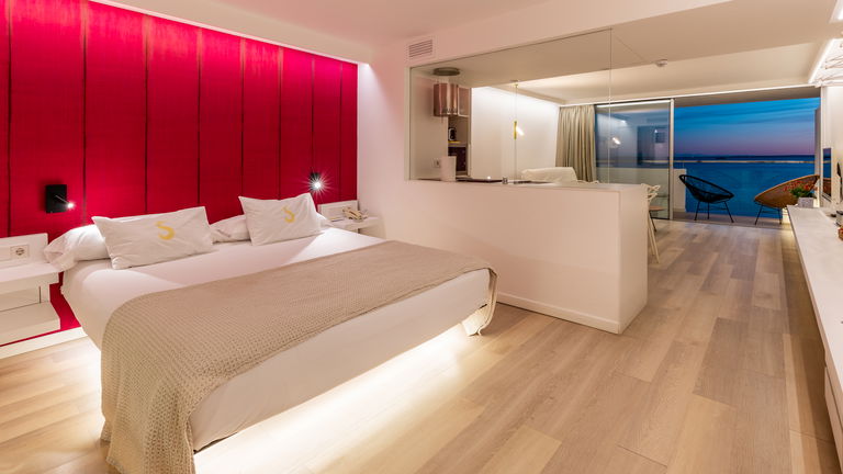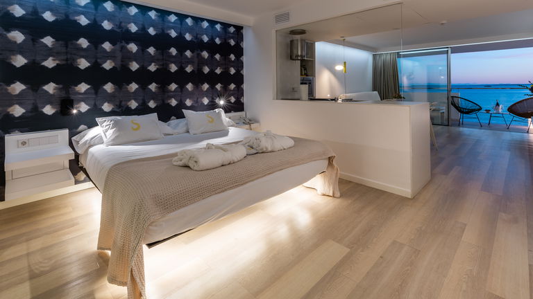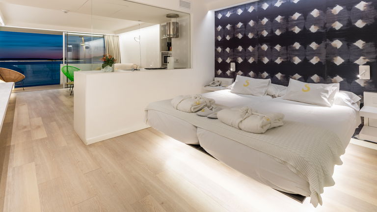 The complex has 12 Sud Heaven studios located on the upper floors of the building. These studios measure approximately 45 m², including a large 7 m² terrace with direct views of the sea and the neighboring island of Formentera. They accommodate up to three people and feature a private bathroom with a hairdryer, a double bed, a safe, a kitchen equipped with a refrigerator, microwave, ceramic hob, Nespresso coffee machine, and dishwasher, and a spacious living area with a sofa bed and flat-screen TV.