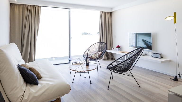 The complex has 4 Grand Sud . They are apartments of approximately 75m2, including a spacious 9m2terrace and maximum capacity for 5 people. They are made up of two double rooms and include a safe, two bathrooms with a hairdryer, a kitchen equipped with a fridge, microwave, ceramic hob and Nespresso coffee machine, dishwasher and a large lounge with a sofa bed and flat screen TV.